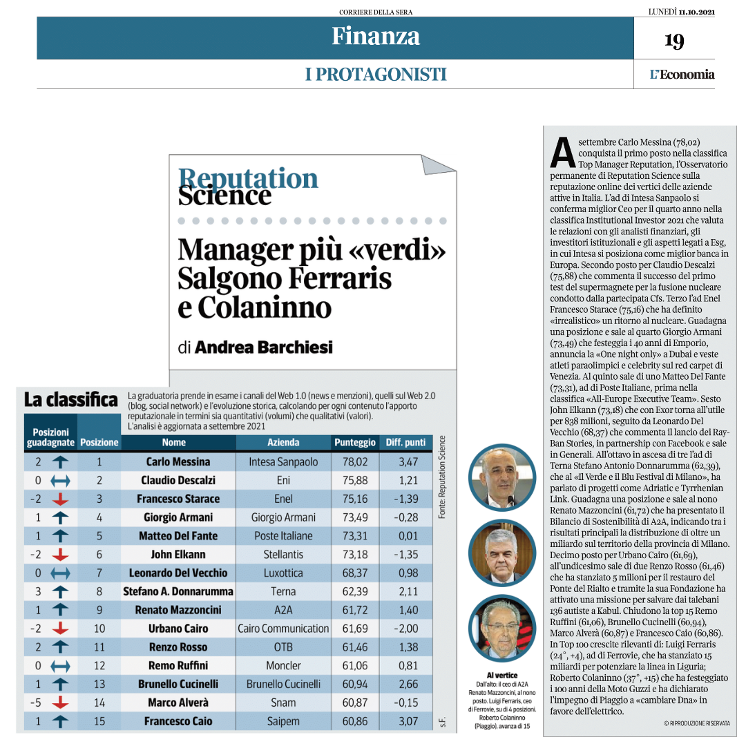 A settembre Carlo Messina (78,02) conquista il primo posto nella classifica Top Manager Reputation, l’Osservatorio permanente di Reputation Science sulla reputazione online dei vertici delle aziende attive in Italia. L’AD di Intesa Sanpaolo si conferma miglior CEO per il quarto anno consecutivo nella classifica Institutional Investor 2021 che valuta le relazioni con gli analisti finanziari, gli investitori istituzionali e gli aspetti legati a ESG, in cui anche Intesa si posiziona come miglior banca in Europa. Secondo posto per Claudio Descalzi (75,88) che commenta il successo del primo test del supermagnete per la fusione nucleare condotto dalla partecipata Cfs, il MoU con Mubadala Petroleum per le opportunità di cooperazione nel settore della transizione energetica e il progetto di Eni per Expo Dubai. Terzo l’AD di Enel Francesco Starace (75,16) che, intervenuto al Forum Ambrosetti ha definito “irrealistico” un ritorno al nucleare e ha espresso soddisfazione per la conferma di Enel nel Refinitiv Diversity Index.