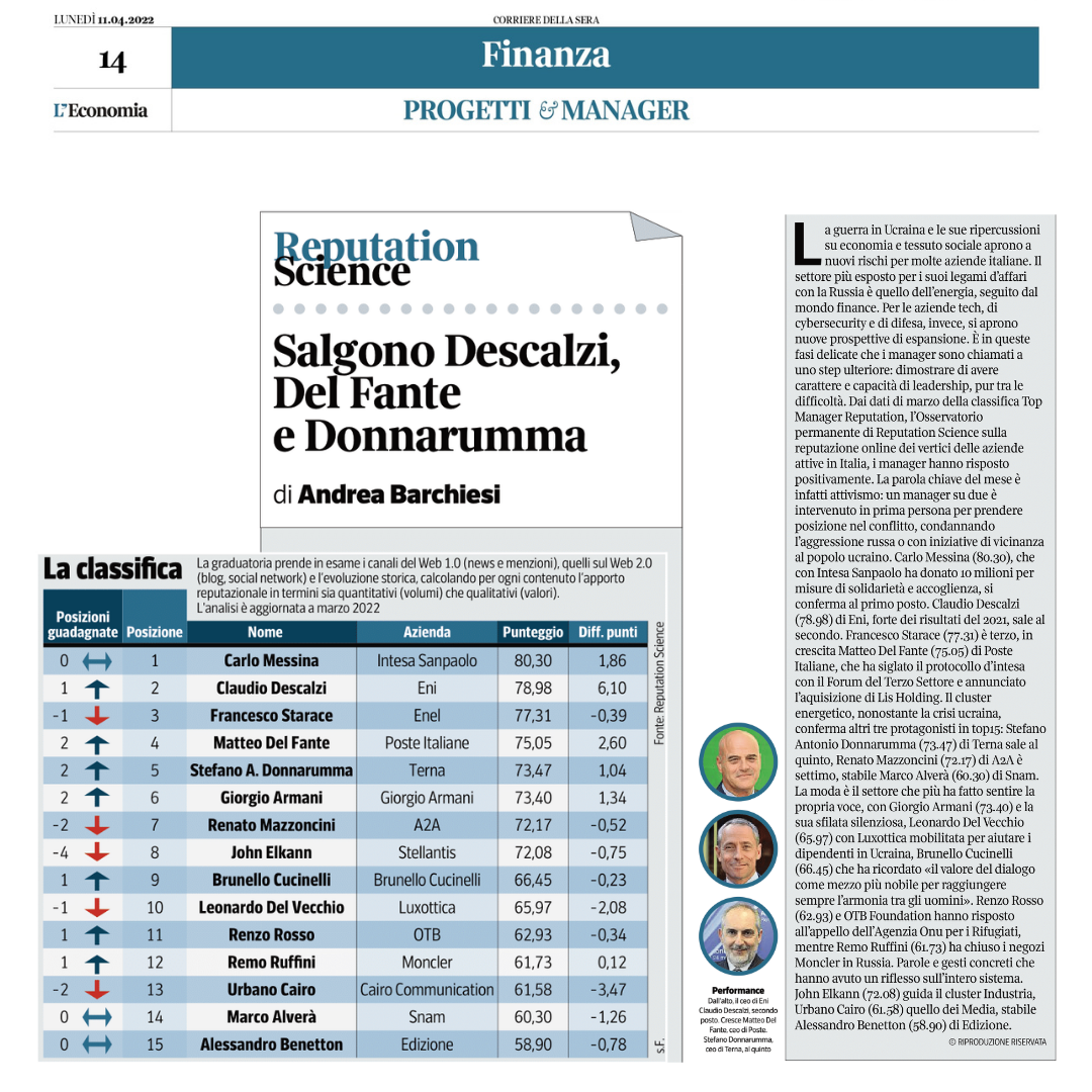 La classifica Top Manager Reputation aggiornata a marzo 2022 e la nostra analisi, a firma Andrea Barchiesi, su L’Economia del Corriere della Sera: